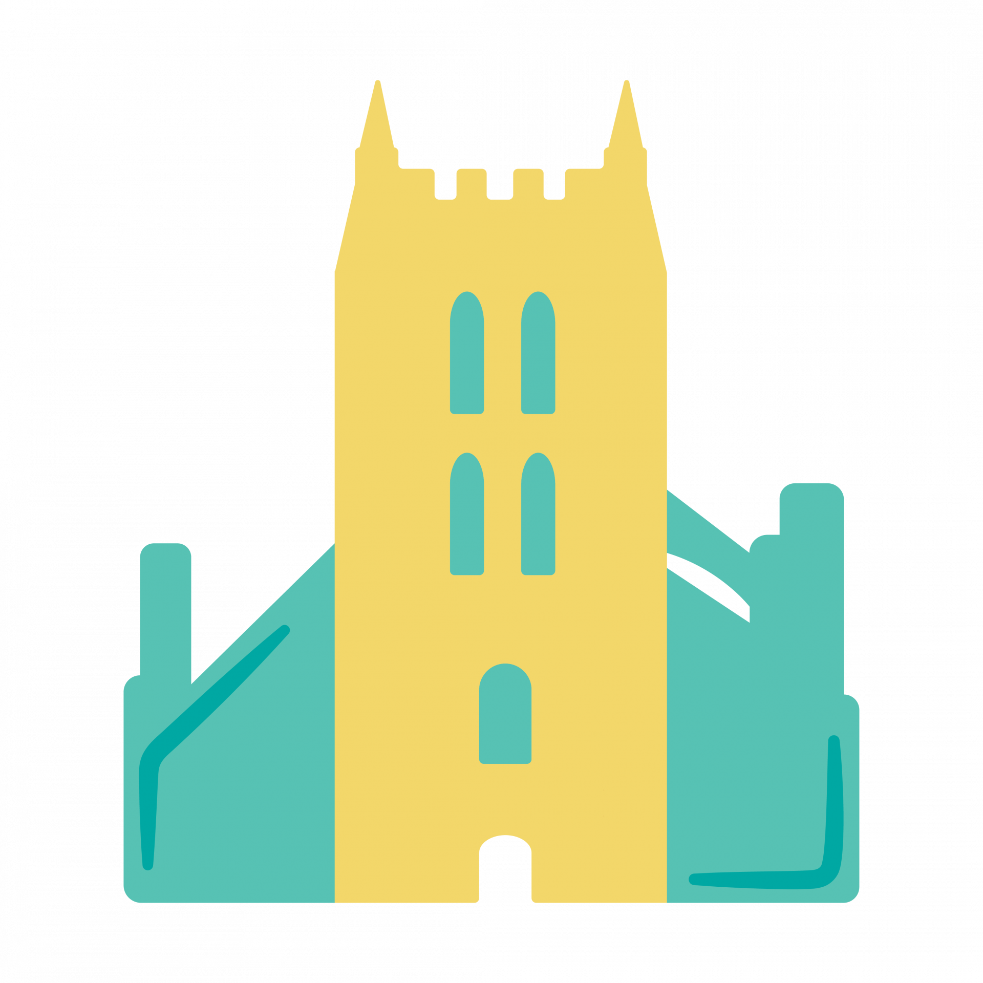Minimalist illustration of a teal lighthouse with simple shapes, balcony railings, and a curved line representing the entrance or base detail, set against a plain white background.